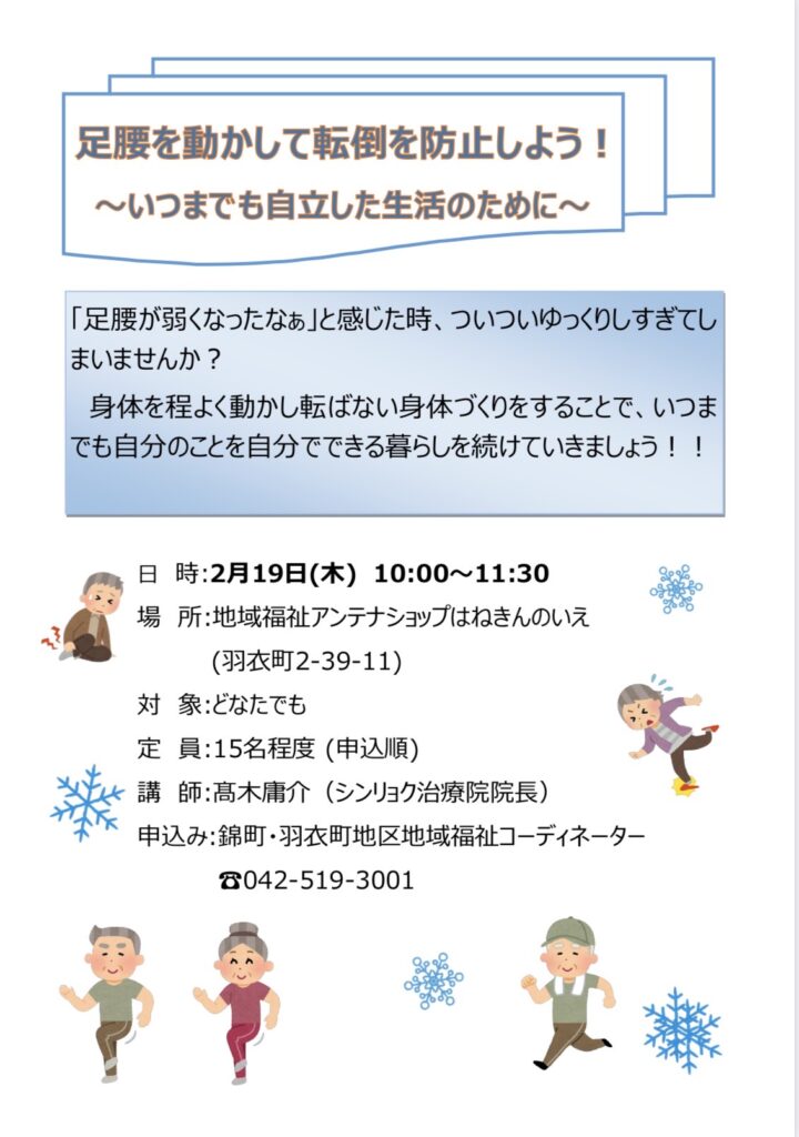 シンリョク治療院では来る2月19日(木)に【地域福祉アンテナショップはねきんのいえ】におきまして、転倒予防に特化した講座を開催させていただきます。