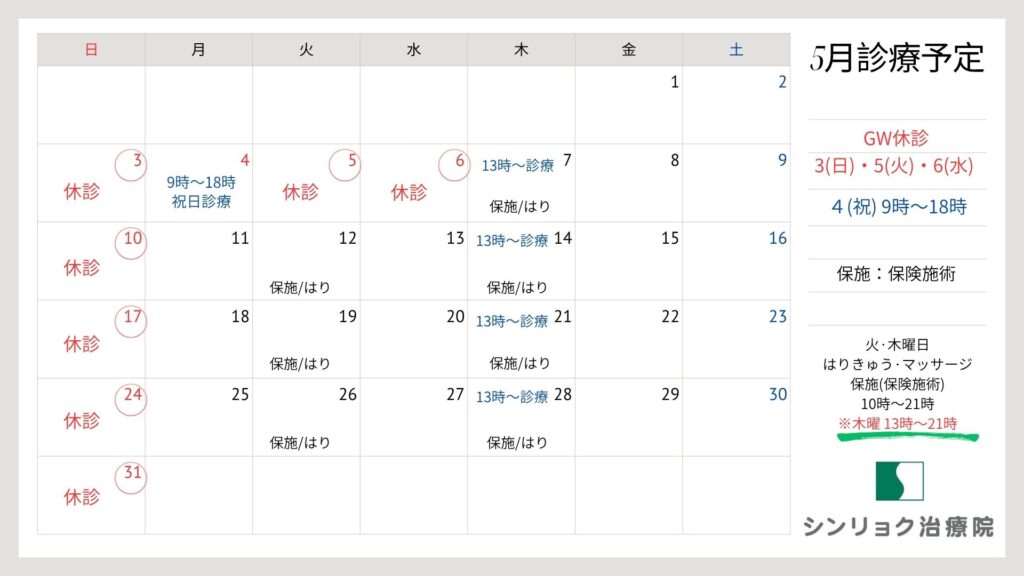 5月もシンリョク治療院をよろしくお願い致します。